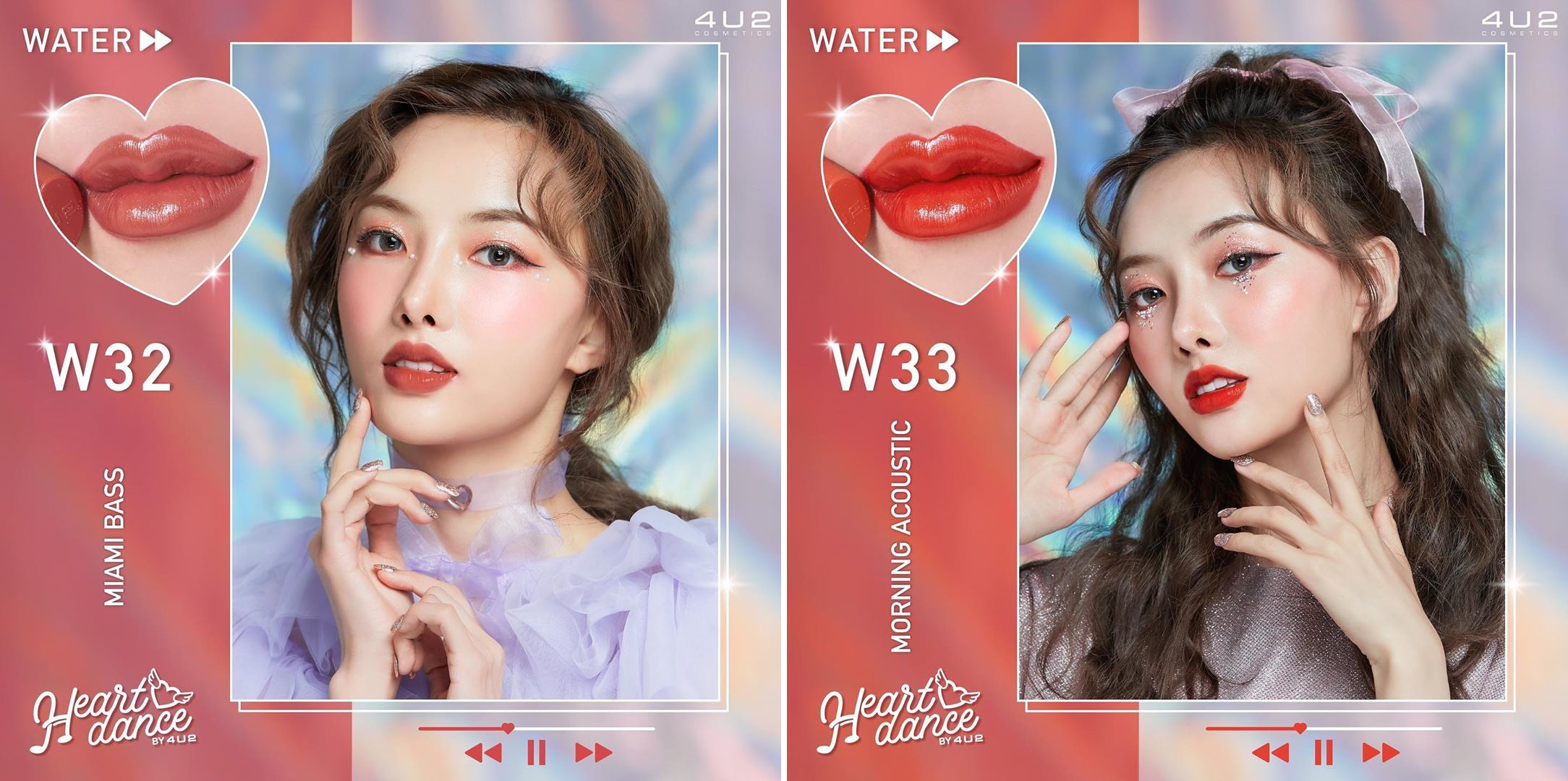 เมื่อไม่นานมานี้ ได้ปล่อยไอเทมใหม่มาเพิ่ม เป็นลิป 2 เนื้อใหม่ ในตระกูล “4U2 Heart Dance Lip Pigment“ ลิปจิ้มจุ่มหัวใจ แพ็คเกจหัวใจสุดคิ้วท์ ผสานวิตามิน C แล E ช่วยบำรุงริมฝีปาก และมีหัวแปรงใบพาย ช่วยให้เกลี่ยง่าย และแม่นยำ มาเริ่มกันที่เนื้อ “Water” ลิปทินท์สูตรน้ำ เนื้อฉ่ำ ริมฝีปากอวบอิ่ม มีตัวทิ้งสี สีติดปาก ให้สีที่ชัดเจน มีให้เลือก 10 เฉดสี คือ เบอร์ W30 – W39