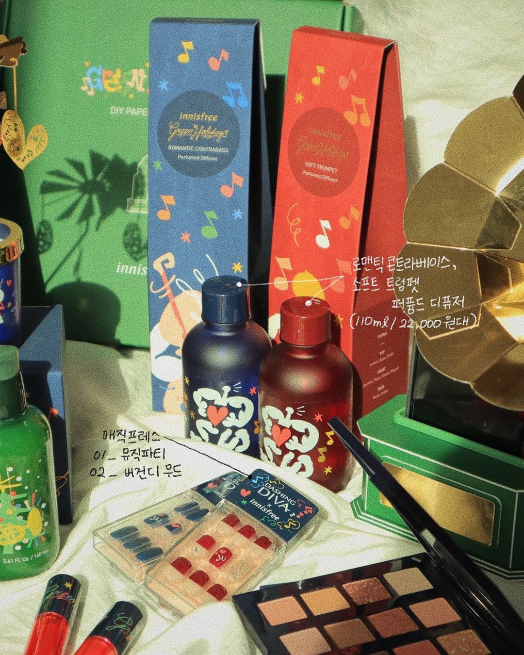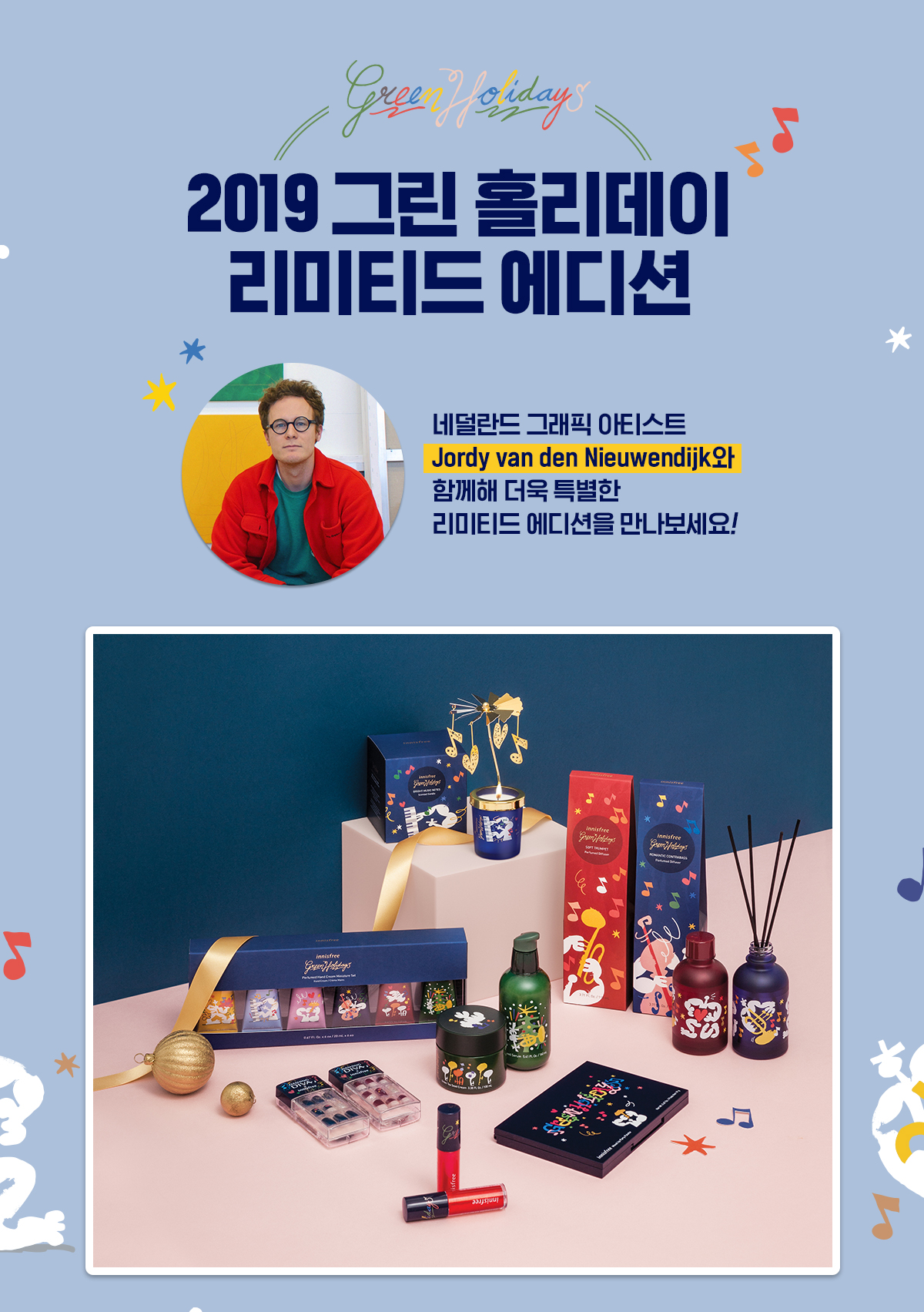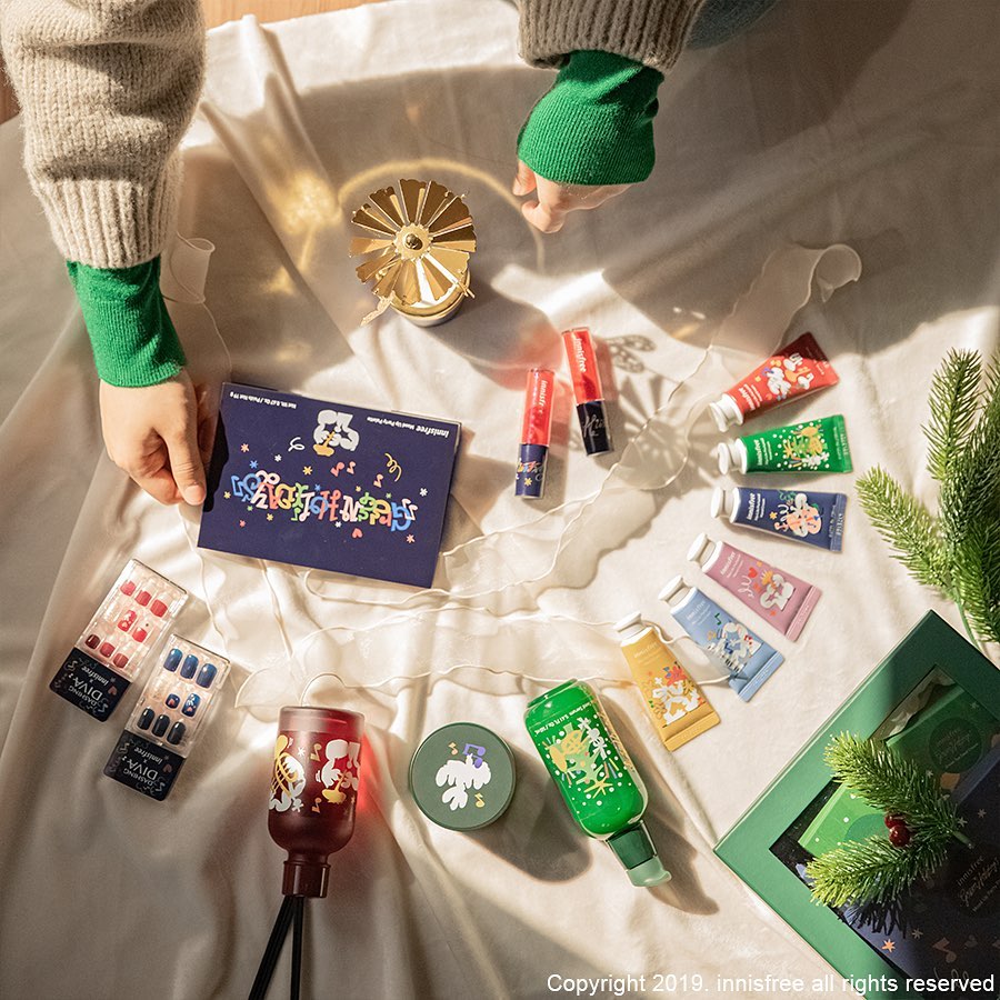 ล่าสุด อินนิสฟรี ปล่อยคอลเล็กชั่นใหม่ ที่มีชื่อว่า “Green Holiday Edition” คอลเล็กชั่นวันหยุด 2019 ลิมิเต็ดเอดิชั่น มาในแพ็คเกจพิเศษ ที่ออกแบบโดยศิลปินกราฟฟิคชาวดัตซ์ จอร์ดี้ (Jordy) มีแนวความคิดมาจากความสนุกสนานและความเป็นอิสระเหมือนกับดนตรีแจ๊ส ออกโปรดักส์มาด้วยกันหลายอย่าง พร้อมลูกเล่น และอุปกรณ์เสริมต่างๆ อาทิเช่น เฟซพาเล, ทินท์, เซ็ตครีมทามือ, เล็บปลอม, เทียนหอม, ครีมทามือ เป็นต้น ส่วนอุปกรณ์เสริมเป็นลำโพงกระดาษ DIY มาในสไตล์ย้อนยุค และเทียนหอมมีลูกเล่น สามารถหมุนได้