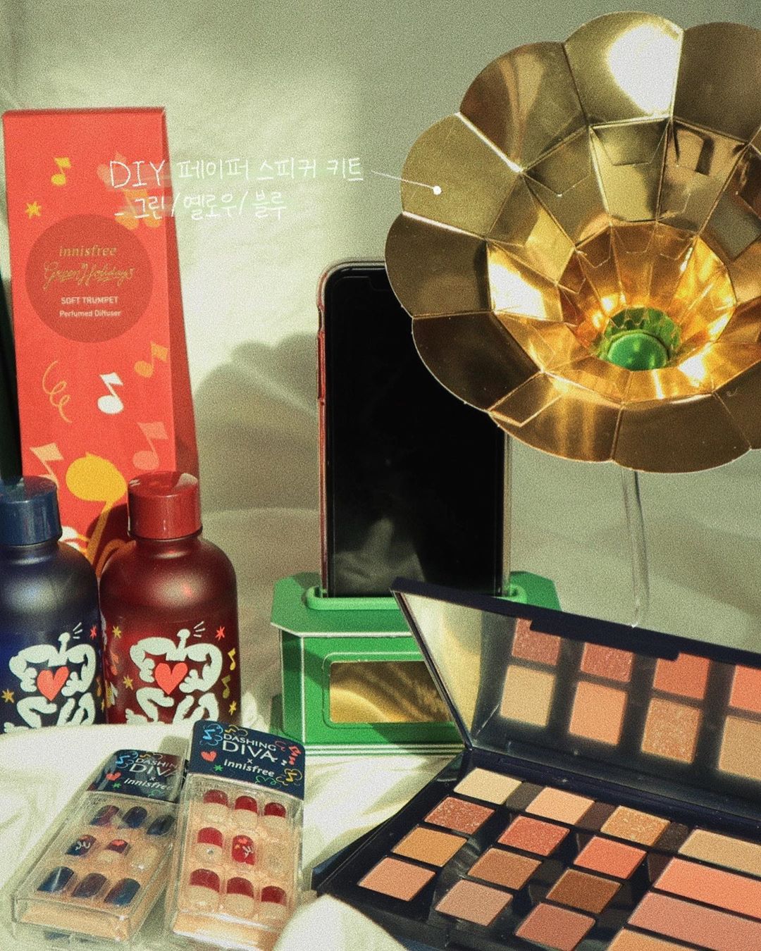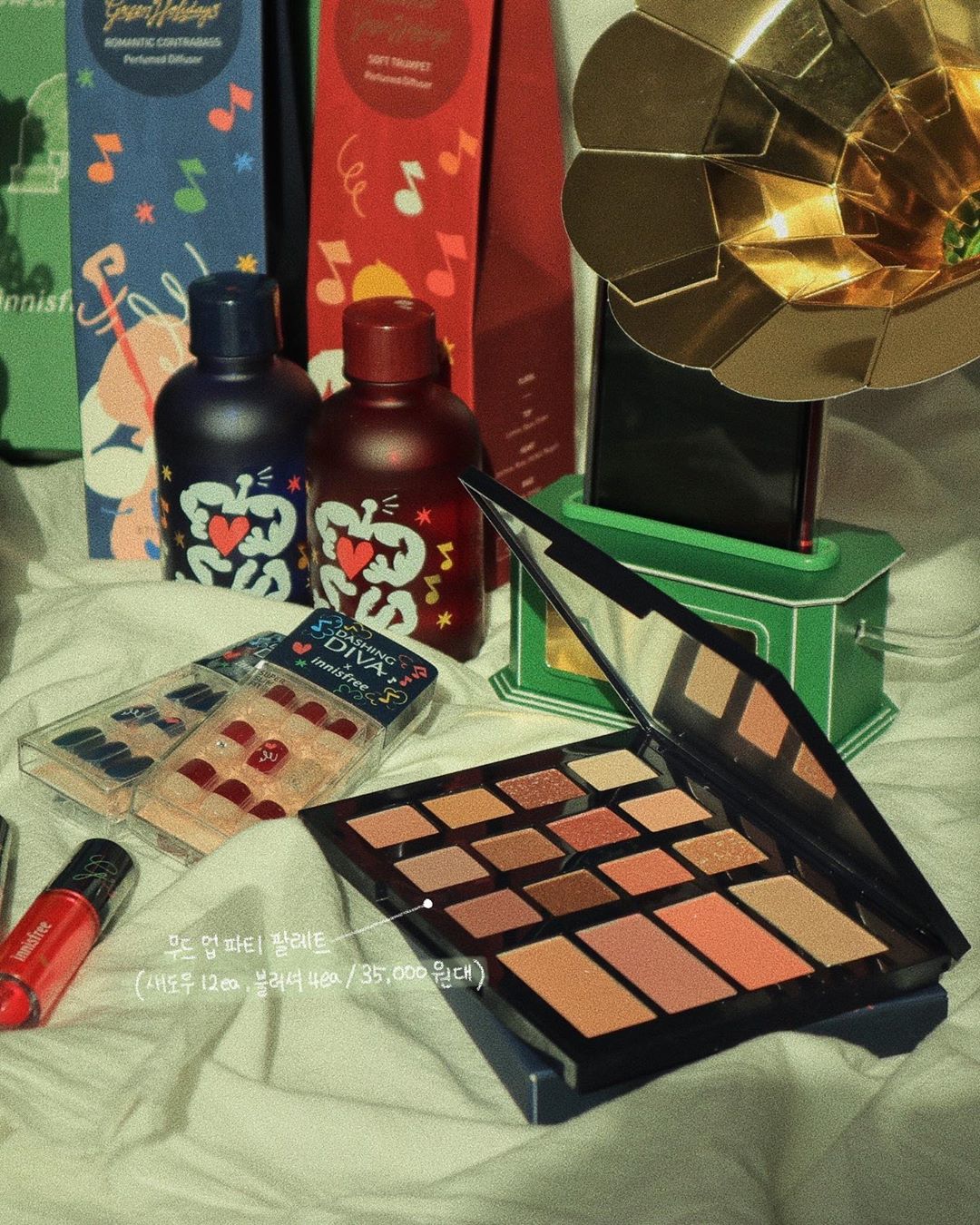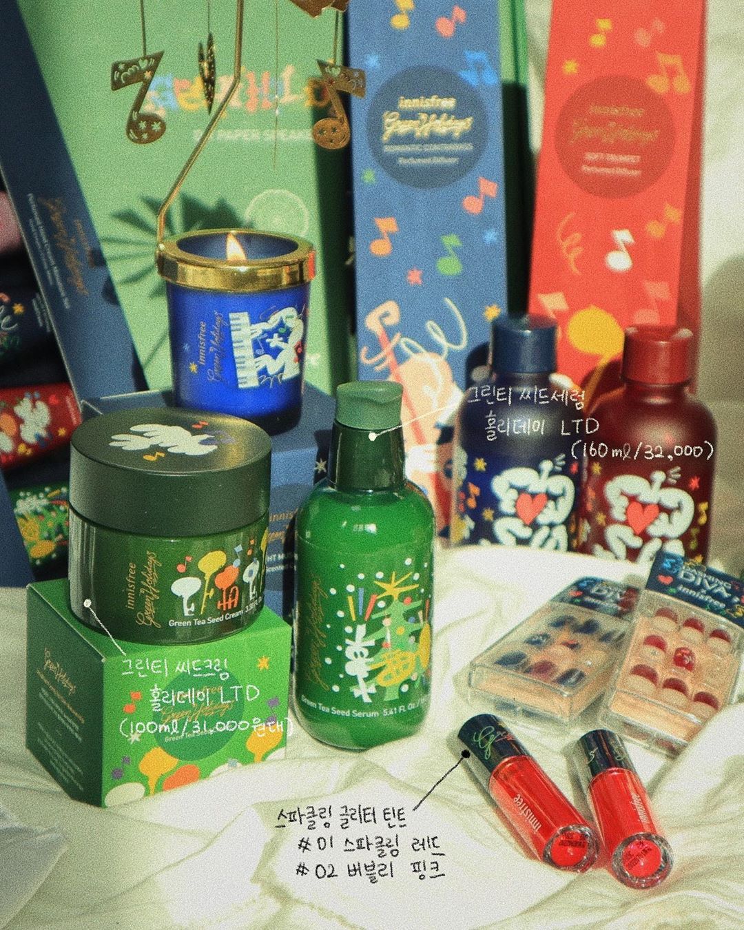 ล่าสุด อินนิสฟรี ปล่อยคอลเล็กชั่นใหม่ ที่มีชื่อว่า “Green Holiday Edition” คอลเล็กชั่นวันหยุด 2019 ลิมิเต็ดเอดิชั่น มาในแพ็คเกจพิเศษ ที่ออกแบบโดยศิลปินกราฟฟิคชาวดัตซ์ จอร์ดี้ (Jordy) มีแนวความคิดมาจากความสนุกสนานและความเป็นอิสระเหมือนกับดนตรีแจ๊ส ออกโปรดักส์มาด้วยกันหลายอย่าง พร้อมลูกเล่น และอุปกรณ์เสริมต่างๆ อาทิเช่น เฟซพาเล, ทินท์, เซ็ตครีมทามือ, เล็บปลอม, เทียนหอม, ครีมทามือ เป็นต้น ส่วนอุปกรณ์เสริมเป็นลำโพงกระดาษ DIY มาในสไตล์ย้อนยุค และเทียนหอมมีลูกเล่น สามารถหมุนได้