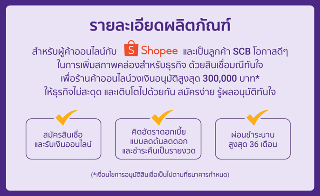 “สินเชื่อมณีทันใจ เพื่อธุรกิจ” เพื่อช่วยเหลือร้านค้าออนไลน์ใน ช้อปปี้ ที่มีการเดินบัญชีผ่านธนาคารไทยพาณิชย์อย่างต่อเนื่อง และขายสินค้าในช้อปปี้อย่างน้อย 3 เดือน สามารถขอ “สินเชื่อมณีทันใจ เพื่อธุรกิจ” เพื่อเพิ่มสภาพคล่องทางการเงินในการทำธุรกิจ ด้วยวงเงินอนุมัติสูงสุด 300,000 บาท ผ่อนหมื่นละ 350 บาทต่อเดือน สำหรับระยะเวลาผ่อนชำระรายงวดนานสูงสุด 36 เดือน ไม่ต้องใช้หลักทรัพย์หรือบุคคลค้ำประกัน ไม่ต้องส่งเอกสารเพิ่มเติม ลูกค้าที่สนใจสมัครต้องลงทะเบียนผ่านแอปพลิเคชัน Shopee ก่อน โดยธนาคารจะใช้เวลาในการพิจารณาอนุมัติภายใน 5 วันทำการ ลูกค้าที่ได้รับการอนุมัติจะได้รับเงินผ่านทาง SCB EASY โดยธนาคารมุ่งมั่นตั้งใจที่จะช่วยบรรเทาความเดือดร้อนและพร้อมที่จะอยู่เคียงข้างลูกค้า