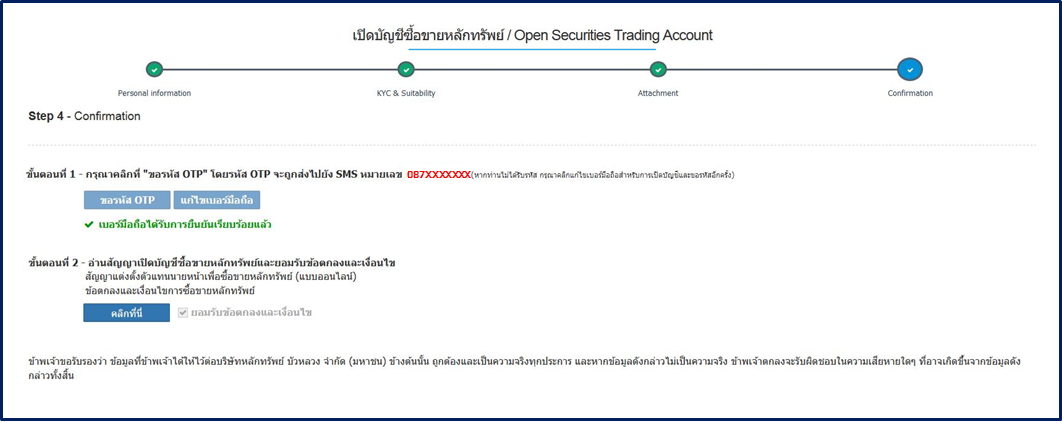 Step 4 : Confirmation ยืนยันข้อมูลเปิดบัญชีหุ้นด้วยรหัส OTP จากนั้นคลิกอ่านสัญญา