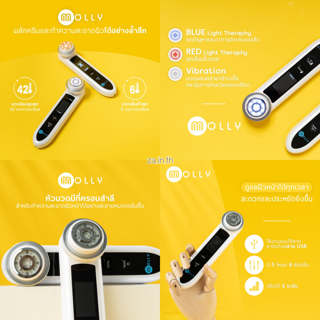 นึกถึงยี่ห้อเครื่องนวดหน้า ยี่ห้อไหนดี ชื่อแบรนด์นี้ต้องลอยเข้ามาในหัวเป็นรายชื่ออันดับต้น ๆ ที่นึกถึงเลย MOLLY BeautiPLUS (ML19011) เครื่องนวดหน้ารุ่นใหม่ปีล่าสุด 2021 นี้เลย ไปดูพร้อมกันเลยดีกว่ากับ 5 โหมดการทำงาน ได้แก่ โหมดทำความสะอาดผิวหน้าโดยใช้ความอุ่นช่วยเปิดรูขุมขน, โหมดนวดเย็นซึ่งมีความเย็นต่ำสุดอยู่ที่ 6 องศา, โหมด EMS Lifting ช่วยนวดผิวพรรณให้เปล่งปลั่ง พร้อมกระตุ้นการไหลเวียนของเลือด, ช่วยกักเก็บความชุ่มชื่นให้กับผิว ผิวดูเด้งอิ่มน้ำยาวนานยิ่งขึ้นและสุดท้ายคือ สามารถช่วยนวดกระตุ้นการสร้างคอลลาเจน เพื่อให้ผิวหน้ากระจ่างใส ห่างไกลจากริ้วรอย ถือเป็นอุปกรณ์นวดผิวหน้าที่สามารถดูแลครบทั้งเรื่องทำความสะอาด ฟื้นฟูปัญหาผิว และมีส่วนช่วยให้ผิวพรรณดู เนียนนุ่ม ดูผิวละเอียด ที่ใคร ๆ ก็สามารถเป็นคนผิวสวยได้เพียงในราคาแค่หลักพันต้น ๆ หากใครที่มีปัญหาสิวอุดตัน ผิวหน้าดูไม่กระจ่างใส เจ้าเครื่องนี้มี แสงสีฟ้า-สีแดง ที่มาช่วยฟื้นฟูปัญหาผิวพรรณอย่างลดการอักเสบ พร้อมฆ่าเชื้อแบคทีเรียที่ให้รูขุมขนสะอาด ไม่ให้เกิดสิวซ้ำซาก เปลี่ยนให้ผิวแห้งกร้านเป็นผิวสมดุล เด้งน้ำนั่นเอง