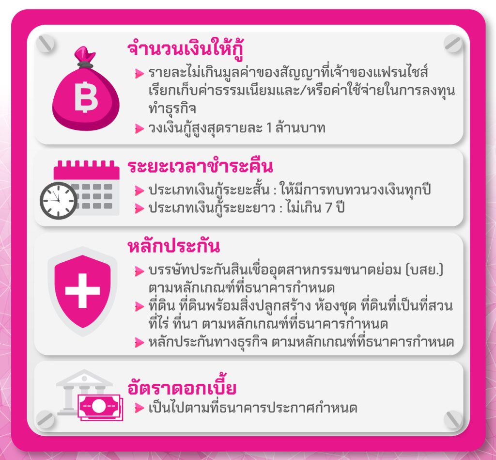 สินเชื่อแฟรนไชส์ จำนวนเงินให้กู้ รายละไม่เกินมูลค่าของสัญญาที่เจ้าของแฟรนไชส์เรียกเก็บค่าธรรมเนียมและ/หรือค่าใช้จ่ายในการลงทุนทำธุรกิจ วงเงินกู้สูงสุดรายละ 1 ล้านบาท ระยะเวลาชำระคืน ประเภทเงินกู้ระยะสั้น: ให้มีการทบทวนวงเงินทุกปี ประเภทเงินกู้ระยะยาว: ไม่เกิน 7 ปี หลักประกัน บรรษัทประกันสินเชื่ออุตสาหกรรมขนาดย่อม (บสย.) ตามหลักเกณฑ์ที่ธนาคารกำหนด ที่ดิน ที่ดินพร้อมสิ่งปลูกสร้าง ห้องชุด ที่ดินที่เป็นที่สวน ที่ไร่ ที่นา ตามหลักเกณฑ์ที่ธนาคารกำหนด หลักประกันทางธุรกิจ ตามหลักเกณฑ์ที่ธนาคารกำหนดอัตราดอกเบี้ย เป็นไปตามที่ธนาคารประกาศกำหนด