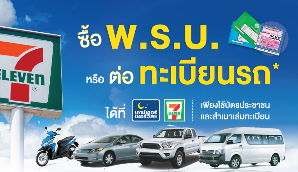 ตอนนี้ 7-Eleven ร้านสะดวกซื้อที่อยู่กับคนไทยมาอย่างยาวนาน มีสาขากระจายทั่วประเทศ ก็มีบริการ พ.ร.บ. รถ ให้ดำเนินการซื้อได้ง่ายผ่าน ผ่านเคาน์เตอร์เซอร์วิสที่ร้าน 7-Eleven ใกล้บ้าน ไม่ต้องเดินทางไปไกลถึงกรมขนส่ง หรือลางานครึ่งวัน เพื่อไปต่อ พ.ร.บ. ทั้งสะดวก รวดเร็ว ประหยัดเวลา เพียงไม่กี่ขั้นตอนเท่านั้น